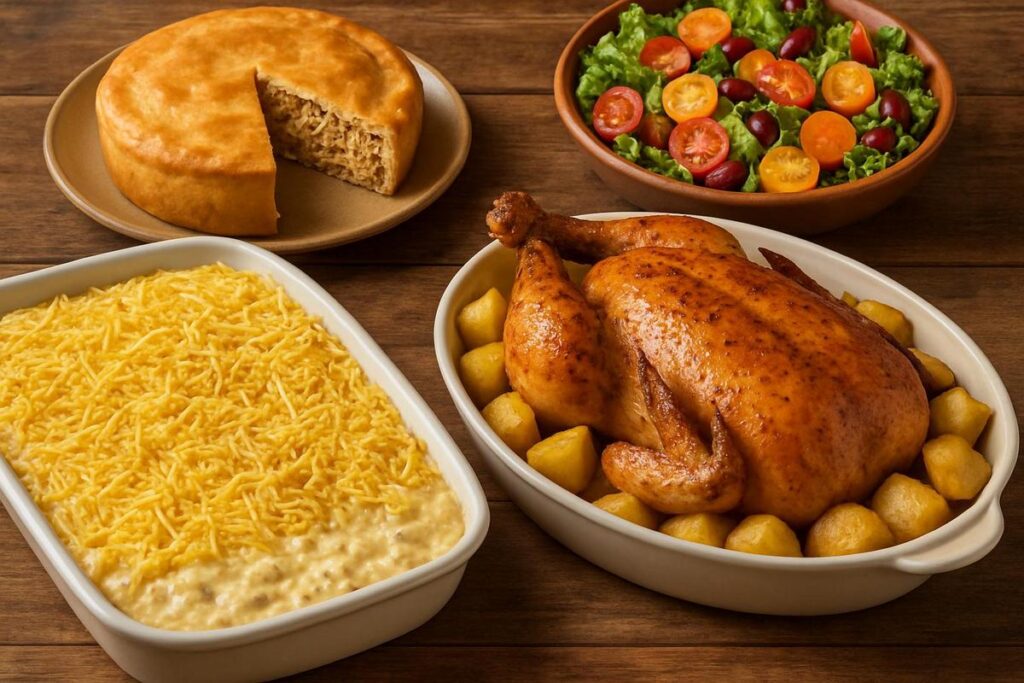 Para mim, um bom frango assado pede acompanhamentos à altura. Gosto de servir com batatas assadas, que pegam todo o sabor do frango, e uma salada fresca. Essa combinação simples completa a refeição e a torna ainda mais memorável.