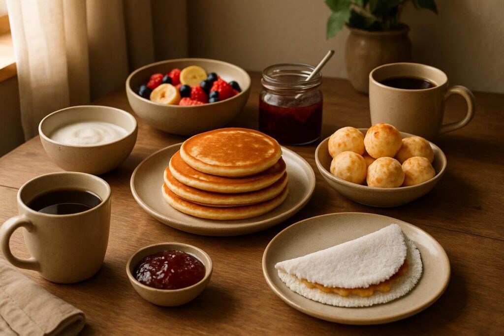 Monte um cardápio equilibrado com pão de queijo, frutas, sucos, iogurte, bolos caseiros, geleias naturais, café e opções salgadas. O importante é variar e garantir que todos se sintam acolhidos logo pela manhã.