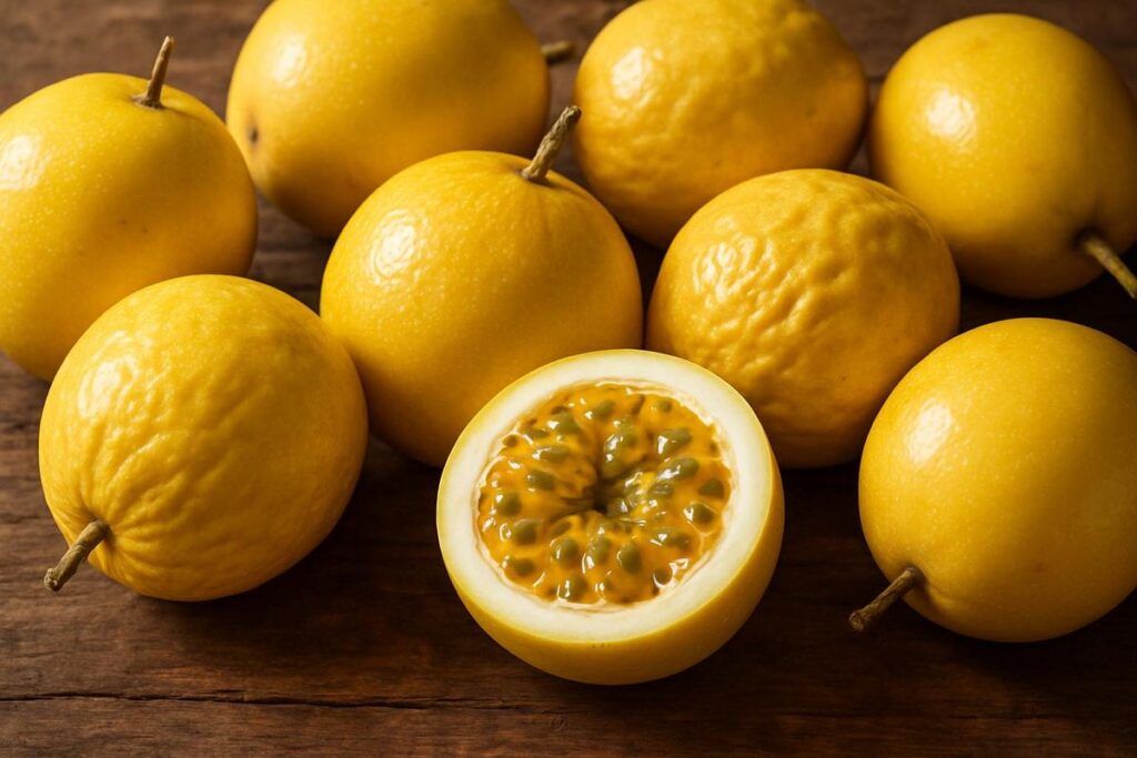 O maracujá está no ponto quando apresenta casca levemente enrugada e cor amarela intensa. Ao apertar, deve ceder suavemente sem estar mole demais. Outra dica é sentir o aroma: se estiver intenso e marcante, indica maturação adequada e sabor mais doce.