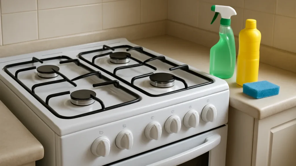 Fogão doméstico limpo e brilhando, exemplo de como tirar gordura do fogão com produtos simples ao lado.