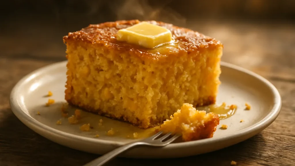 Fatia de bolo de milho de lata no liquidificador, ainda morna, com manteiga derretendo por cima e vapor subindo, miolo amarelo e fofo com grãos de milho visíveis, servida em prato sobre mesa rústica.