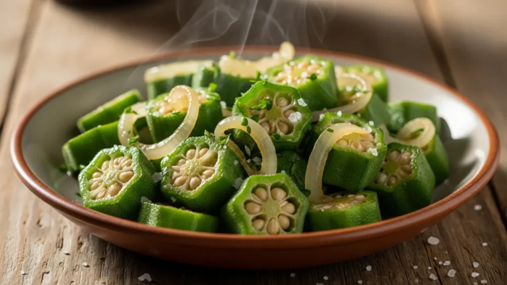 Close-up de quiabo refogado verdinho e brilhante, sem baba, com fatias mostrando sementes, cebola translúcida e cheiro-verde picado, vapor sutil e brilho de óleo, servido quente em tigela rústica sobre mesa de madeira — Quiabo refogado perfeito: o truque simples que corta a baba