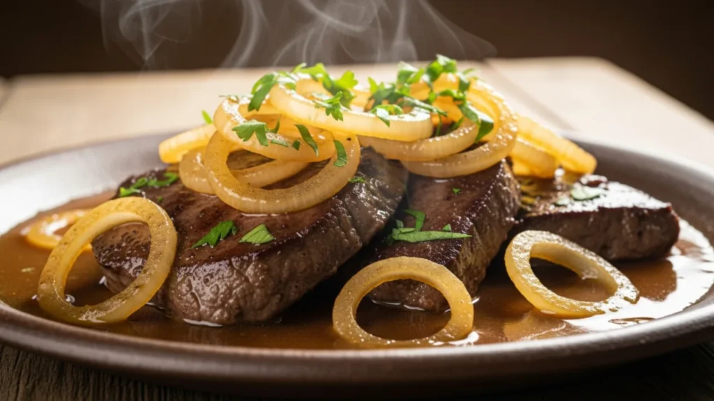 Fígado acebolado suculento: o truque do vinagre que tira o gosto forte