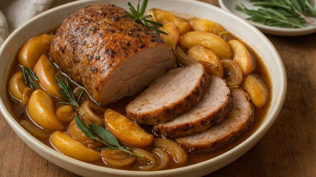 Aprendi essa receita durante uma viagem à casa de um amigo chef, que me mostrou como o lombo pode ficar incrivelmente suculento quando braseado com maçãs e cebola. Desde então, virou meu prato especial de domingo, sempre despertando aquela memória afetiva de cozinha acolhedora e aromas de família.
