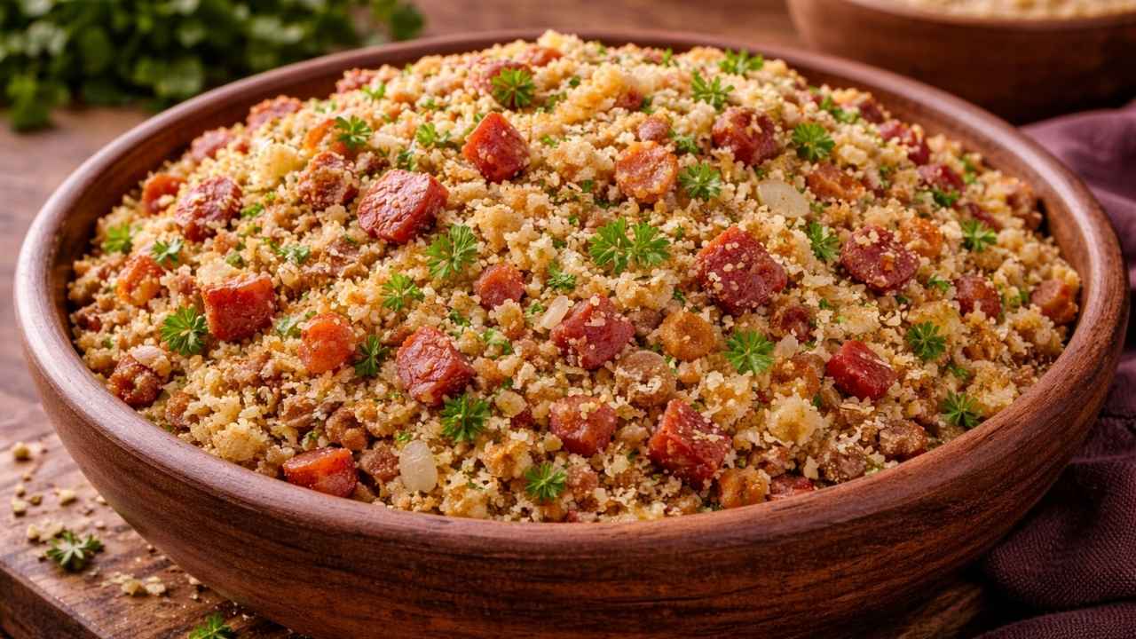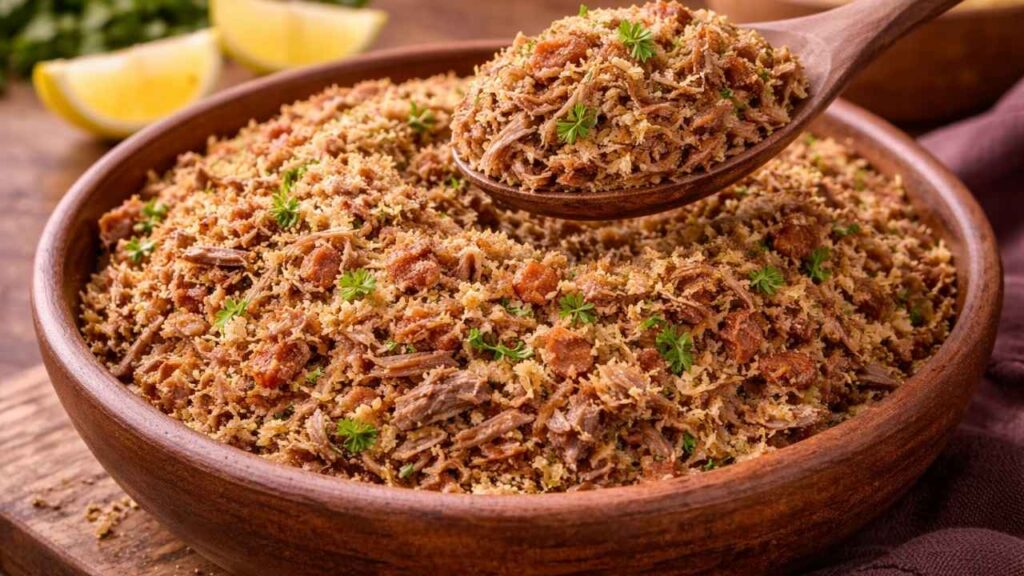 Essa paçoca nordestina carrega lembranças de feira livre, pilão de madeira e conversa boa na cozinha. Aprendi que ela não pede pressa: a carne precisa estar bem desfiada e a mistura, feita com carinho. É comida de sustança, que alimenta o corpo e aquece o coração.