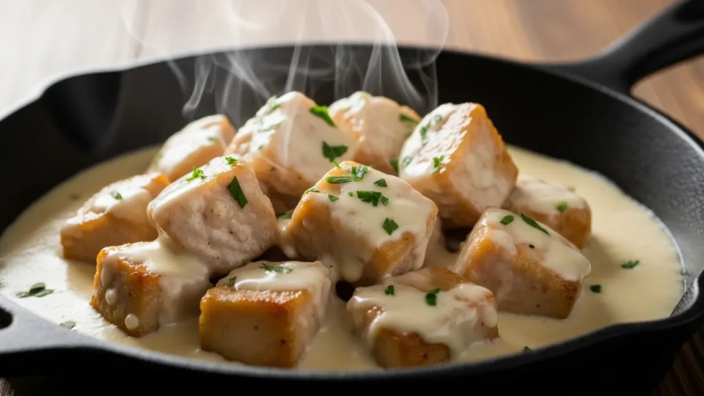 Volte ao fogo baixíssimo por 1 min apenas para aquecer, sem ferver. Finalize com salsinha e descanse 5 min antes de servir para o molho “assentar” e ficar ainda mais cremoso.