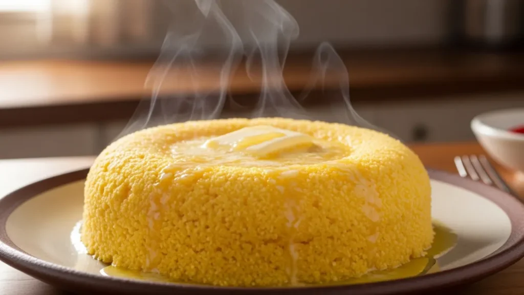 Close-up de um cuscuz nordestino amarelo e fofinho em um prato, com um pedaço de manteiga derretendo na superfície e soltando vapor.