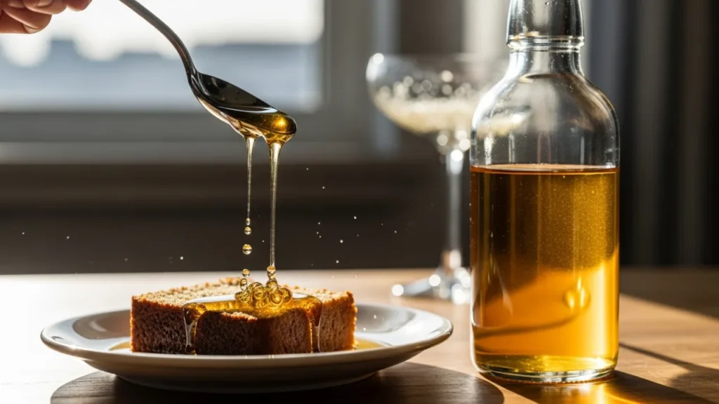 Garrafa de vidro com xarope de açúcar translúcido e brilhante sendo derramado de uma colher sobre uma fatia de bolo úmido, luz natural de fundo realçando a textura aveludada — xarope de açúcar simples.