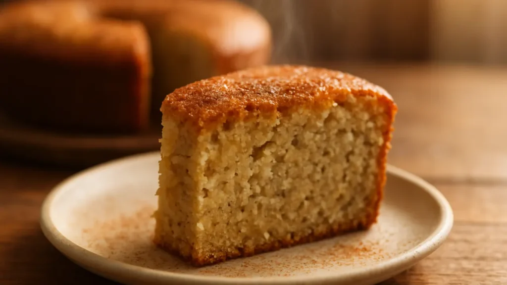 Close-up de uma fatia morna de bolo simples e fofo com miolo aerado e úmido e crosta dourada, migalhas visíveis e leve vapor, servida em prato rústico sobre mesa de madeira — receita de bolo simples e fofo.